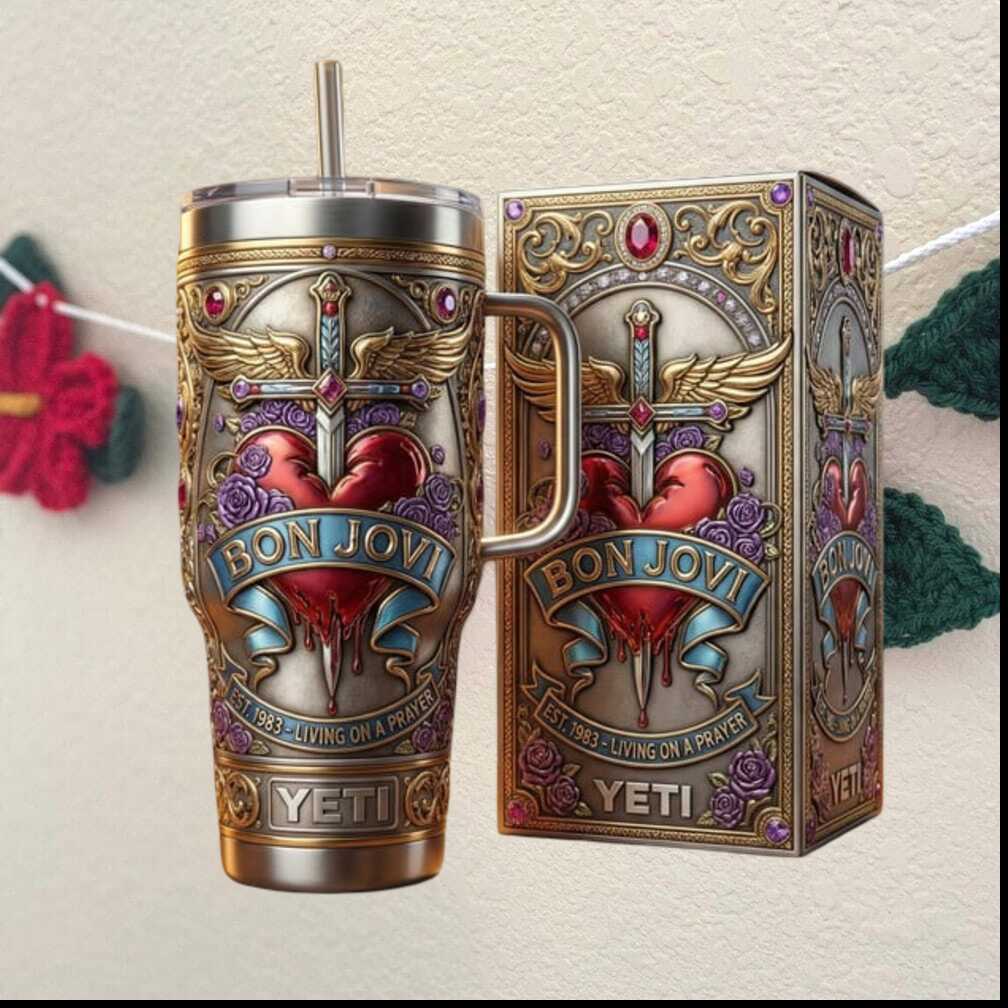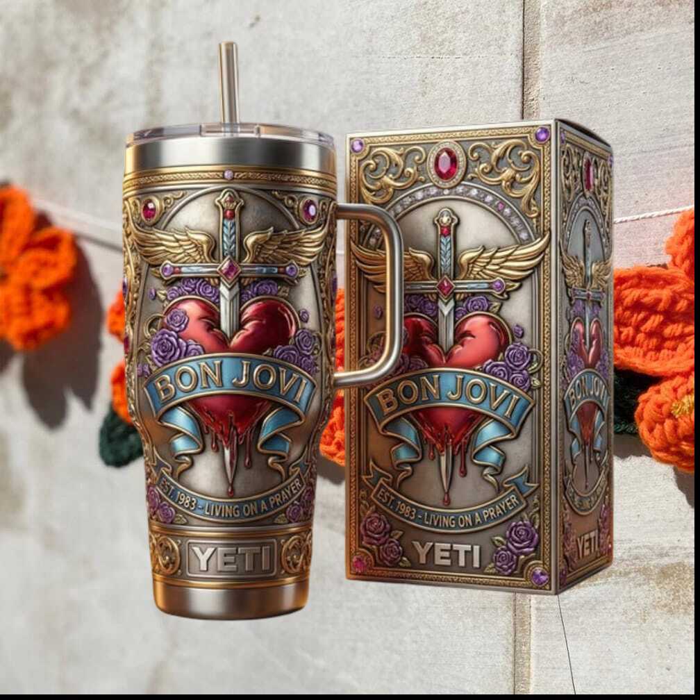 Halfway there and sipping in style. This vintage heart-and-dagger Bon Jovi tumbler captures the spirit of one of rock’s most beloved anthems in a beautifully designed drinkware piece.