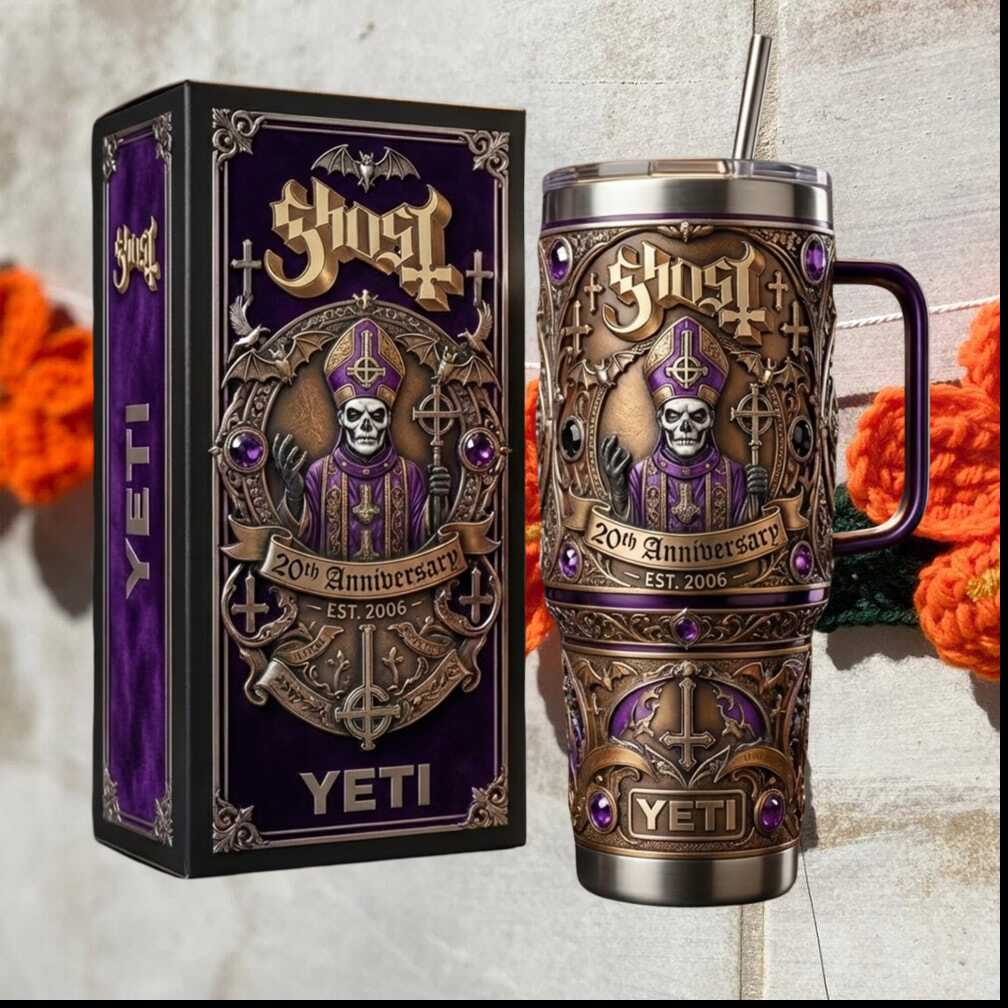 Papal blessings in 40oz form. This Ghost Band 20th Anniversary Est. 2006 Papa Emeritus collector’s tumbler is a luxury tribute to one of rock’s most theatrical acts — dark artwork, premium insulation, and an aesthetic as mysterious as the band itself.