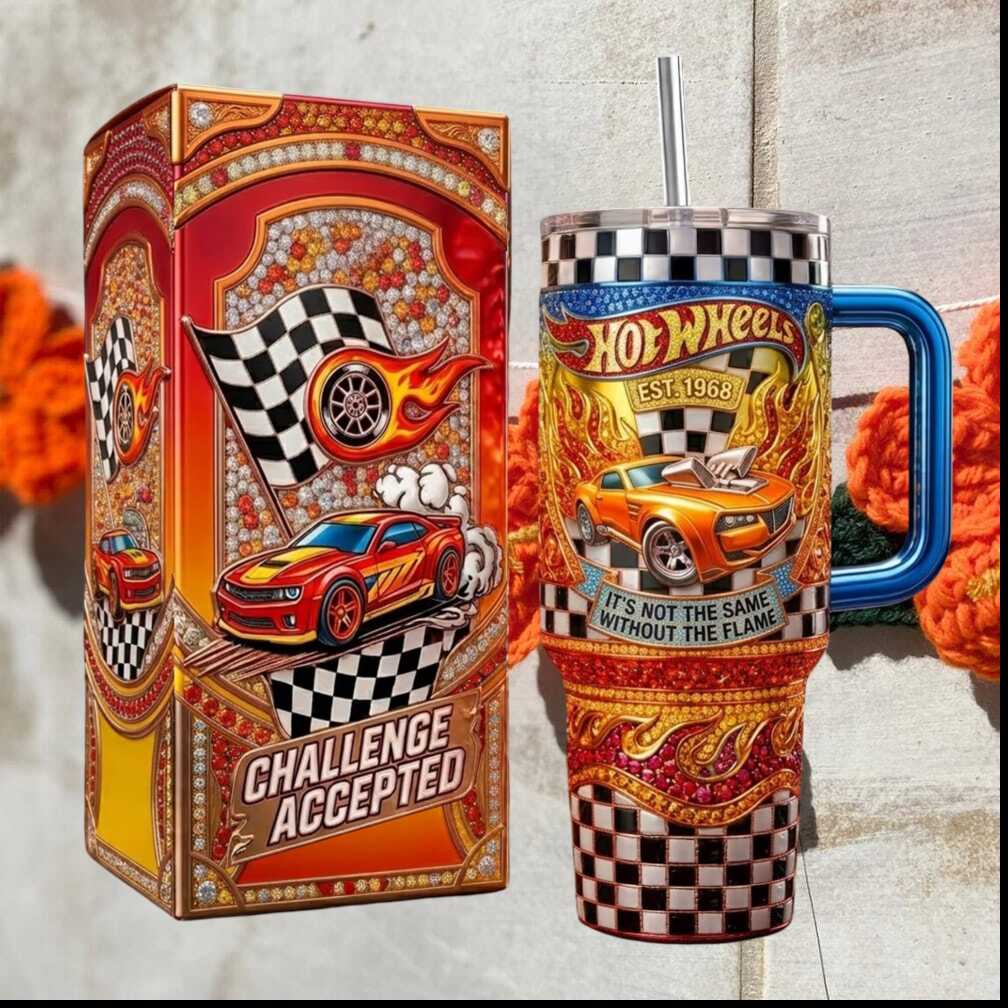 Challenge accepted. This Hot Wheels Racing Flame 40oz tumbler ignites your inner child and keeps your drinks ice cold. Iconic Hot Wheels flame and speed graphics on premium stainless steel — the perfect gift for collectors and racers young and old.