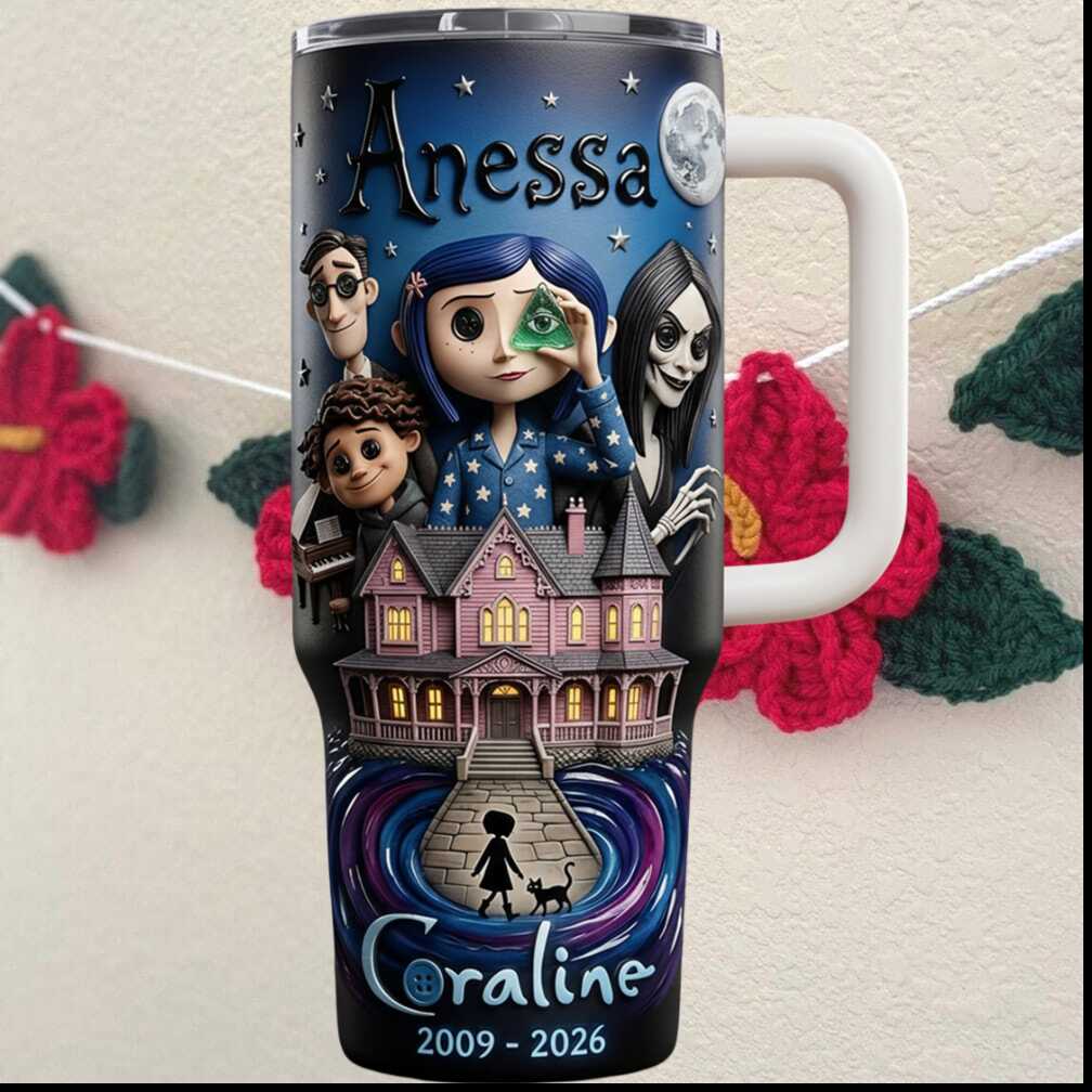 Mark 17 years of Coraline’s enchanting other world with this personalized anniversary tumbler. Dark, whimsical, and beautifully detailed — a unique gift for fans of Neil Gaiman’s beloved story.