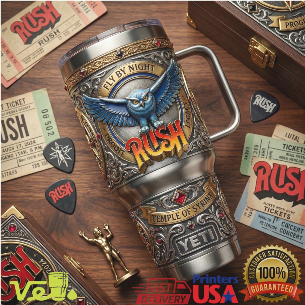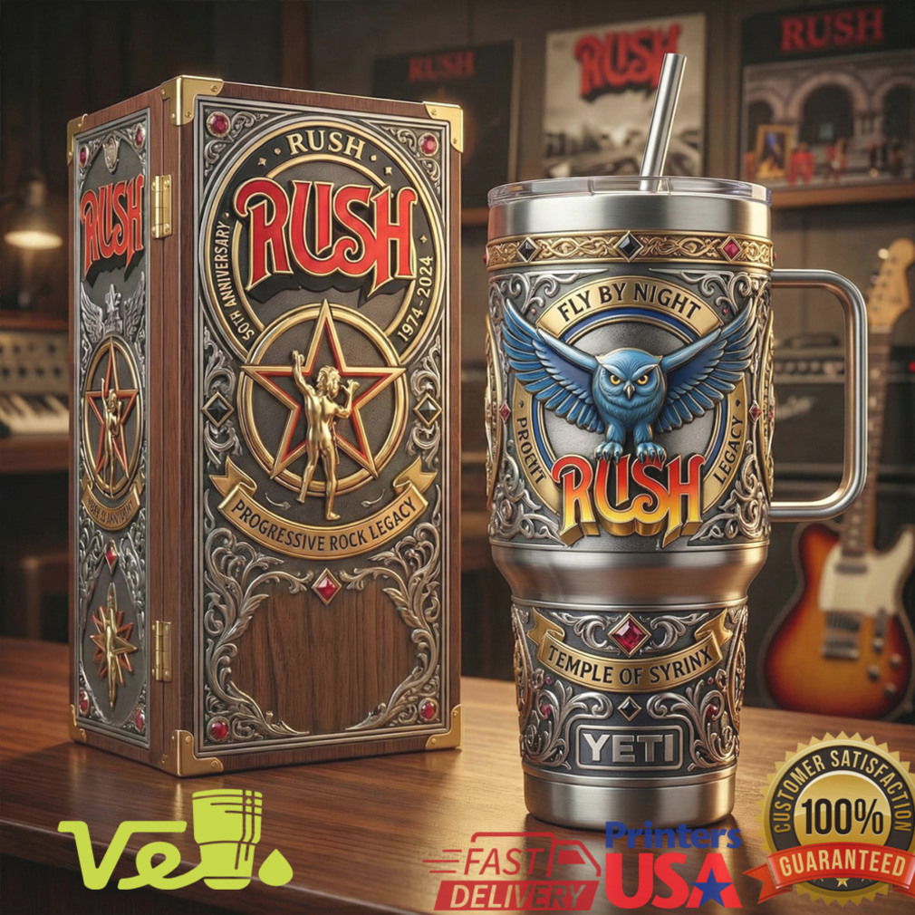 The Owl watches over your hydration — celebrate 50 years of Rush’s Fly by Night with this Temple of Syrinx tribute 40oz tumbler. Epic progressive rock legacy meets collector’s craftsmanship. For the dedicated fans who know 2112 by heart.